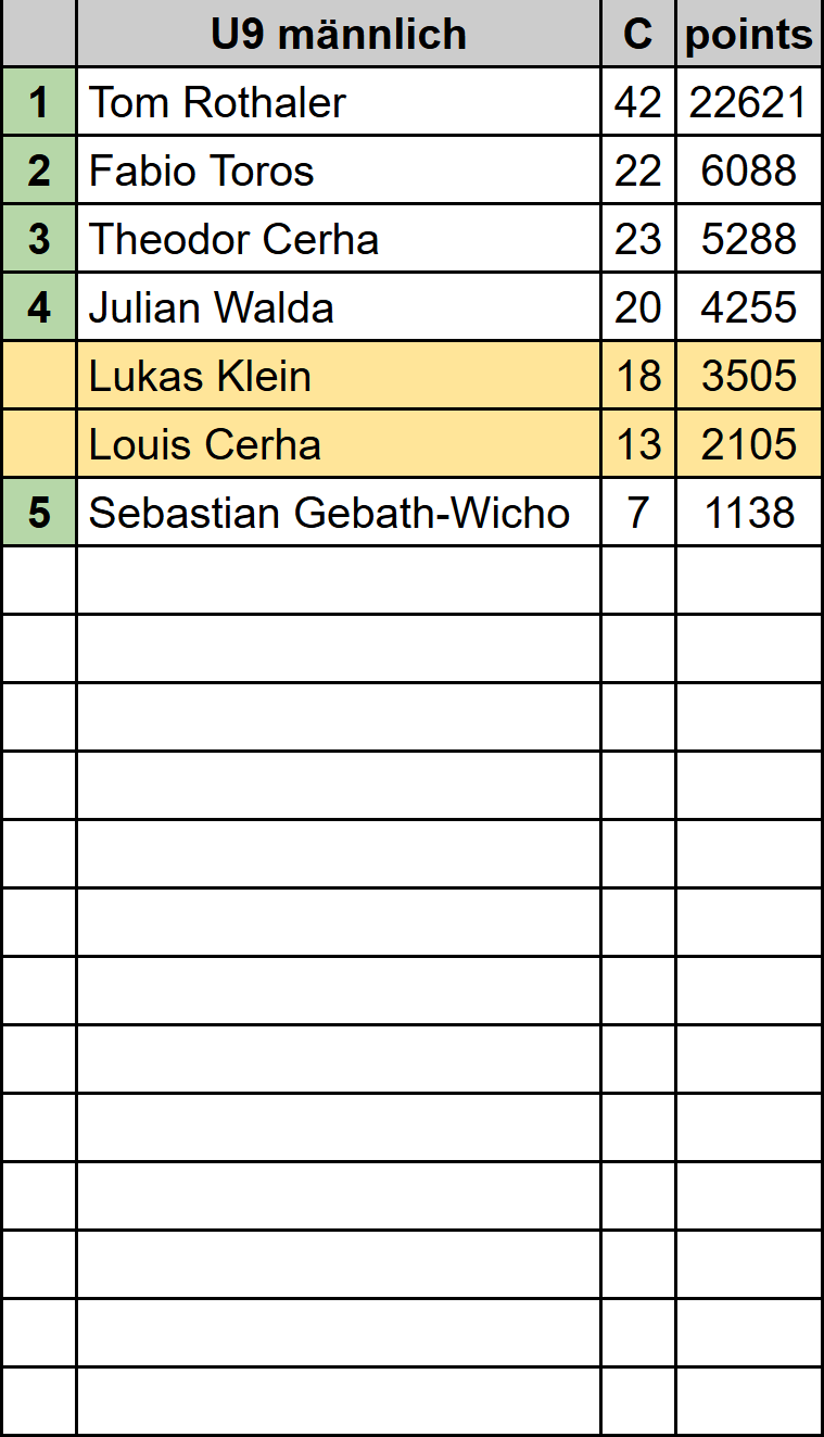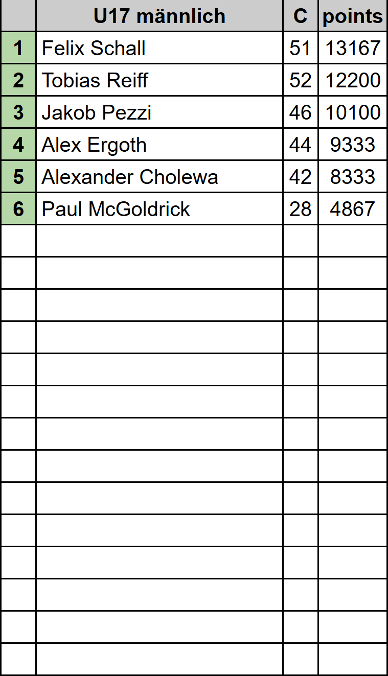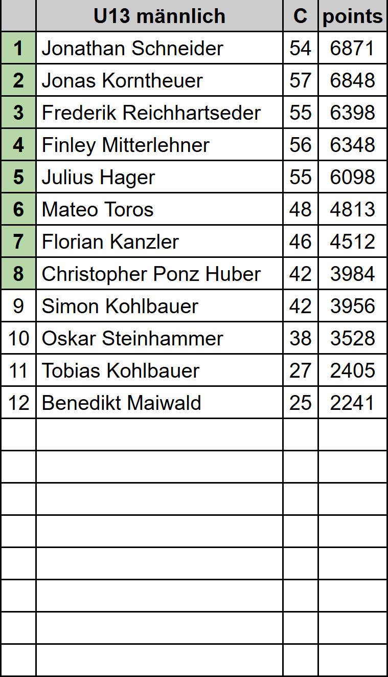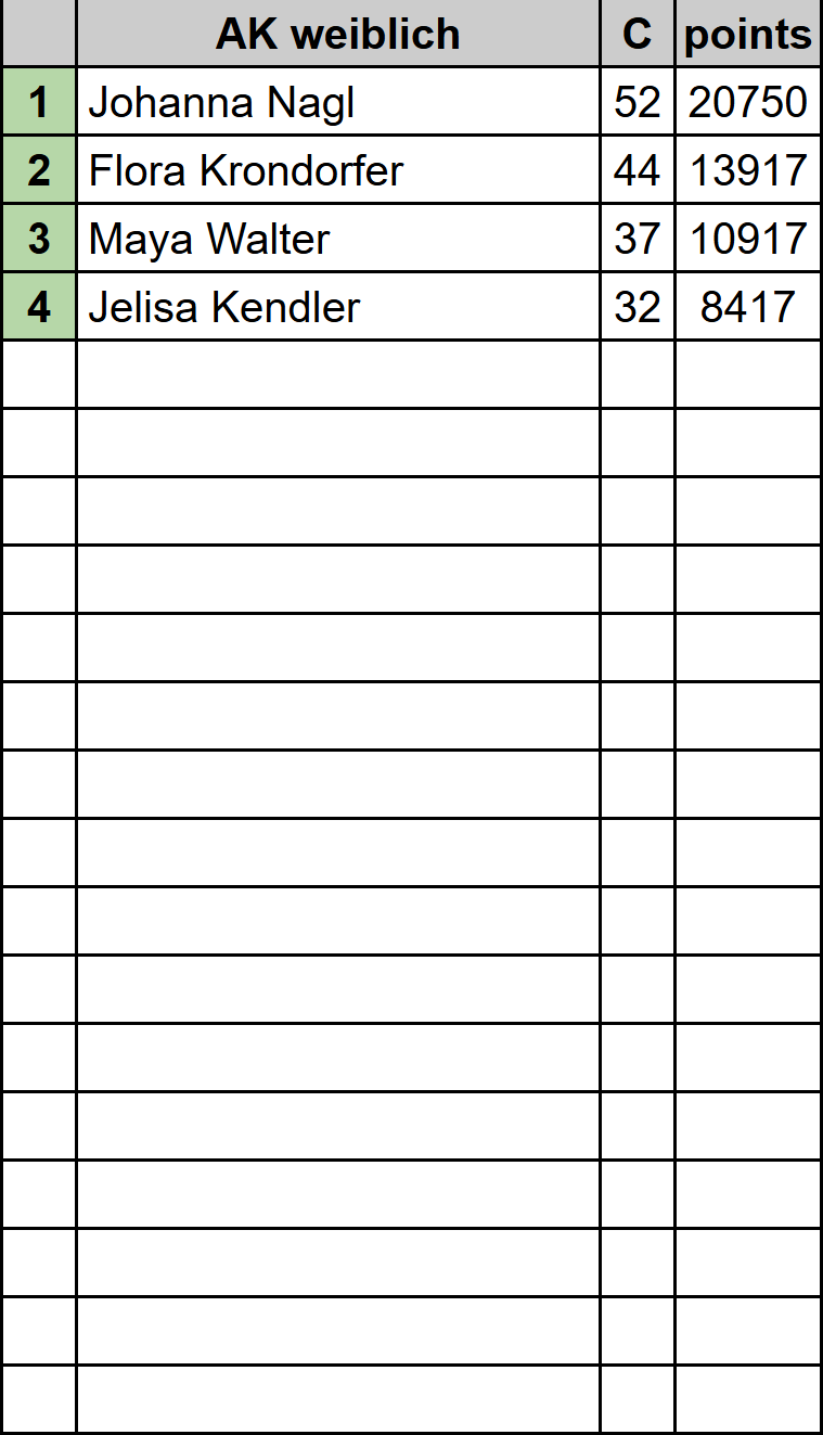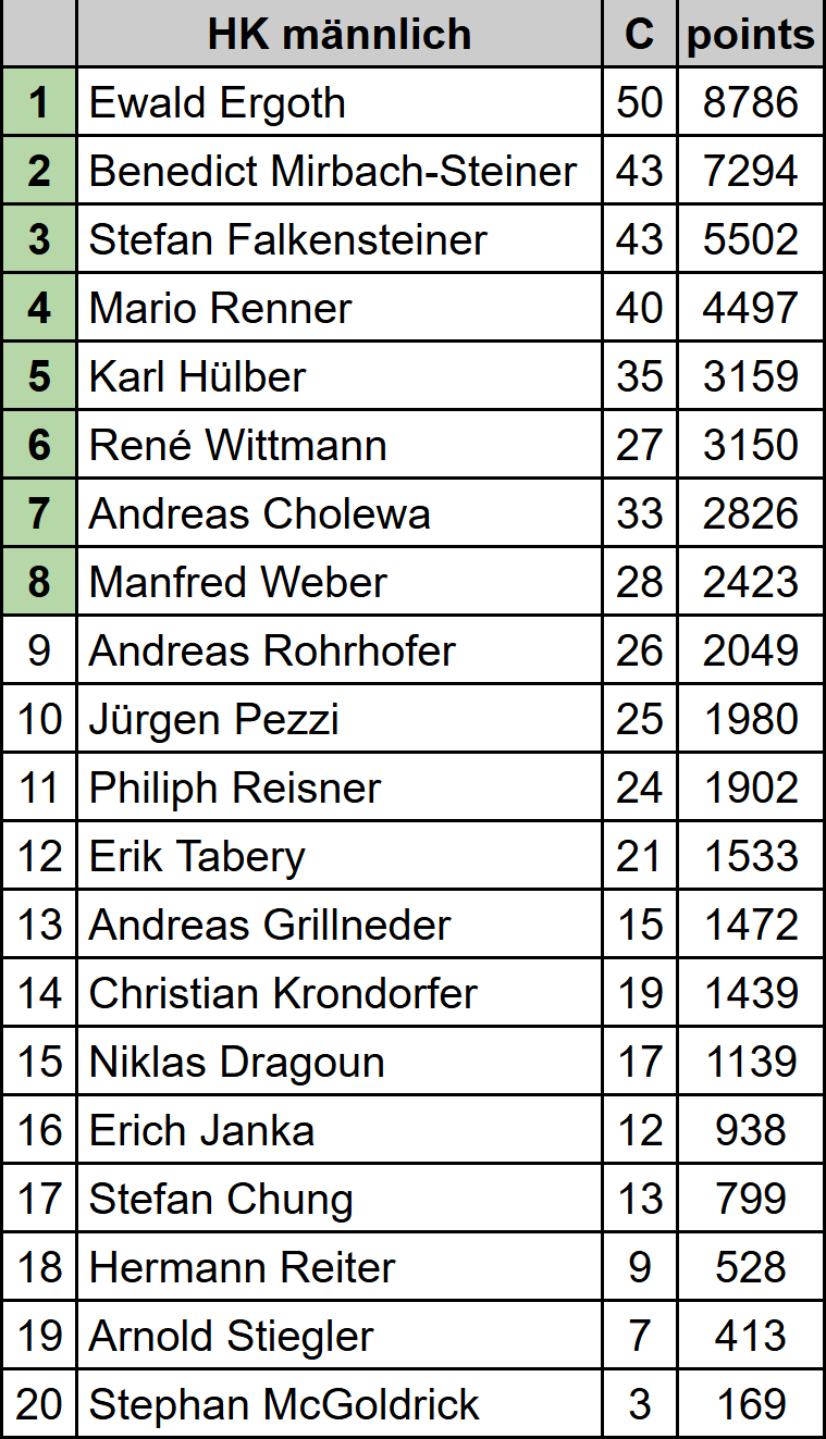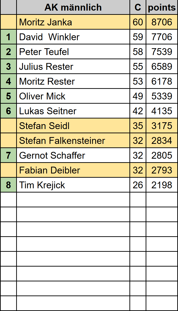 Der letzte Tag der Kraftwerkchallenge ist verstrichen und damit nun hier der “finale” Zwischenstand. Wir bitten um eine Rückmeldung aller Finalisten ob sie am 25.1. Zeit haben um am Finale teilzunehmen. Sollte einer der Finalisten ausfallen rückt der Nächste nach. Es sind natürlich alle Teilnehmer herzlich zum Finale eingeladen, am Ende des Tages nehmen alle anwesenden Teilnehmer an einer Tombola teil!